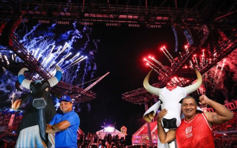 Item 3 – Marujada e Batucada: Conjunto que faz o acompanhamento percussivo das toadas, sendo base para o espetáculo. A Marujada compõe o Caprichoso e a Batucada compõe o Garantido.